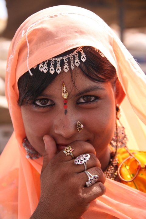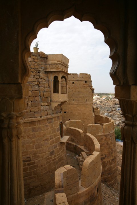The rounded-belly-shaped walls of the golden sandstone fort of Jaisalmer tower above the little sweet shop. Not long ago the whole city was housed within those walls but it burst at its seams. The winding streets, like umbilical cords, crept out over the desert sands. Around the corner from the sweet shop is an arched entrance to the fort, guarded by a group of Rajasthani women, their eyes glinting as brightly as the jangly anklets they sell. They do not give up. They call and screech, rainbow lorikeets of the Thar desert.